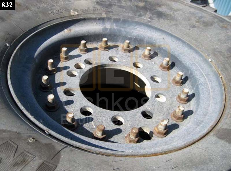 1600R20 Michelin XZL or Goodyear Tubeless Tire on HEMTT Wheel. Michelin 16.00R20 XZL or Goodyear Tire Mounted 2-Piece Wheel 90%+. Can be used to Super Single 5-Tons and are original equipment on M977 HEMTT Oshkosh Trucks. May have blemishes or minor imperfections but are in serviceable condition.