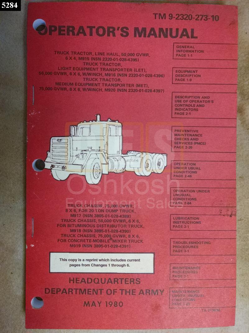 Operator's Manual for AM General Models M915, M916, M917, M918, M919, and M920 Military Trucks.