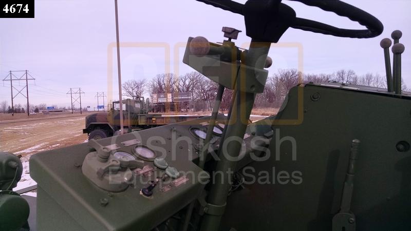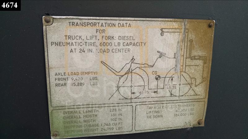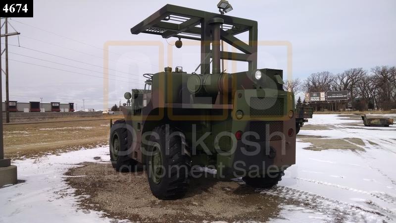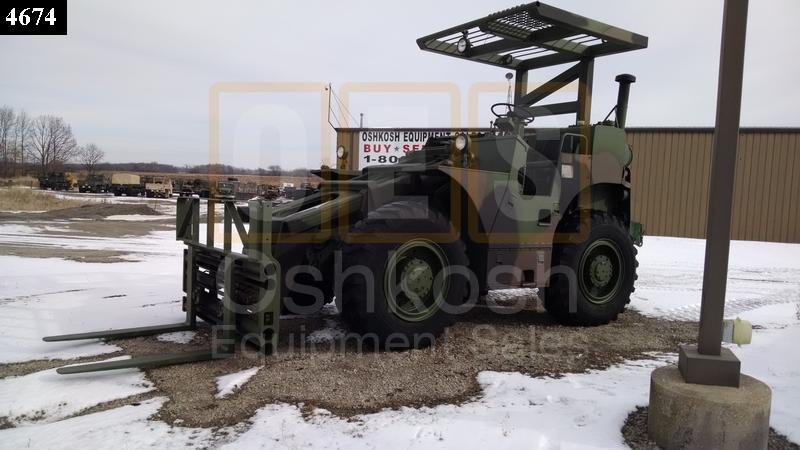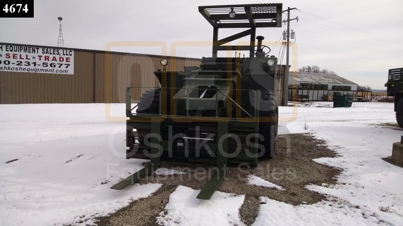 Fully Reconditioned Military Rough Terrain Forklift with 6,000 lb capacity, Four Wheel Drive, 3 Speed Transmission, Selectable Steering ( 2 Wheel, 4 Wheel, Crab) Fork Side-Shift, Full Machine Tilt, and Roll over Protection. Powered by a 4 cylinder Detroit Diesel 453. This unit has only seen 395 hours of use. Fork tips are unworn and like new. These lifts are very user friendly and easy to operate. We have been using these machines at our facility for many years and have proven very versatile and dependable.